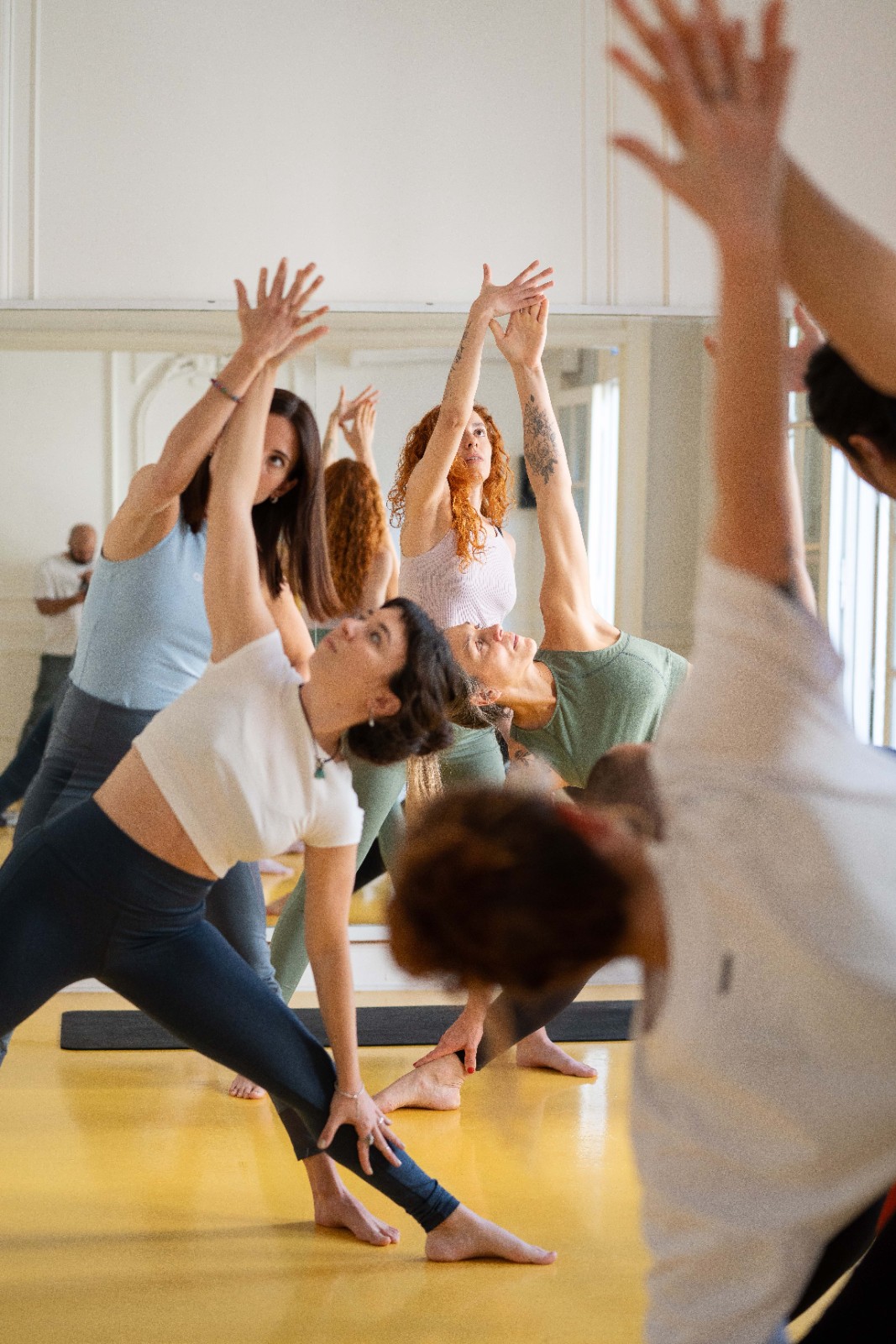 Formación de yoga postural moderno con enfoque en biomecánica y elementos de vinyasa.